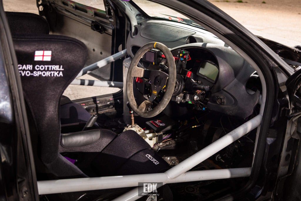 The running gear of the car is a full Mitsubishi EVO 4G63 Engine with EVO 456 Running gear (4WD Included) Running a Norris Designs Dry Sump Kit, Twin 044 Fuel pumps feeding that 4G63 Engine from a superb AU fuel cell with swirl pots and to keep everything cool Gari runs his own custom Rad setup & intercooler setup & Coil on plug kit however, Gari Didnt stop there, the chassis is now fully caged out and now sits on some lovely custom Meister R Coilovers to keep it sturdy through the bends, EVO Brembo’s are also featured with 2 Piece disks and Ferrodo pads, Floor mounted pedal boxes and Competition clutches to lay down the power & a plumbed in fire extinguisher to keep everyone safe!
